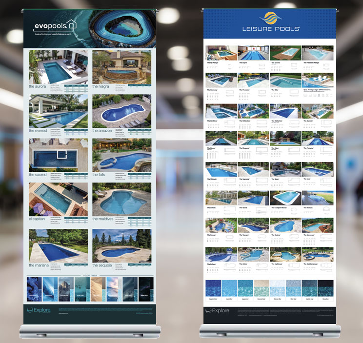 Pull-Up trade show banners to showcase brand pool designs for the various industry dealer shows.